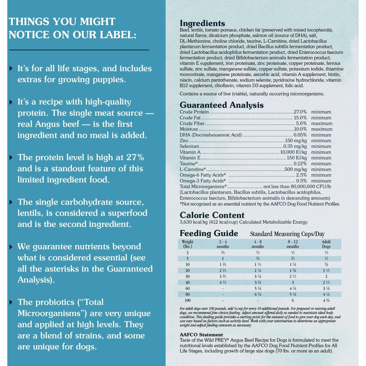 Feed your dog the diet nature intended with Taste of the Wild PREY Angus Beef Recipe Limited Ingredient Recipe Dry Dog Food. Made with pasture-raised Angus beef as the first of just four simple ingredients, this limited ingredient diet is highly digestible and simply packed with meaty flavor and complete and balanced nutrition. It’s fortified with guaranteed levels of probiotics to support good digestion, with precise levels of vitamins, minerals, antioxidants, omega fatty acids and DHA to ensure your pup’s getting everything he needs. Give your red-blooded canine the red meat flavor his wild appetite craves with this beefy, nutrient-packed feast!
