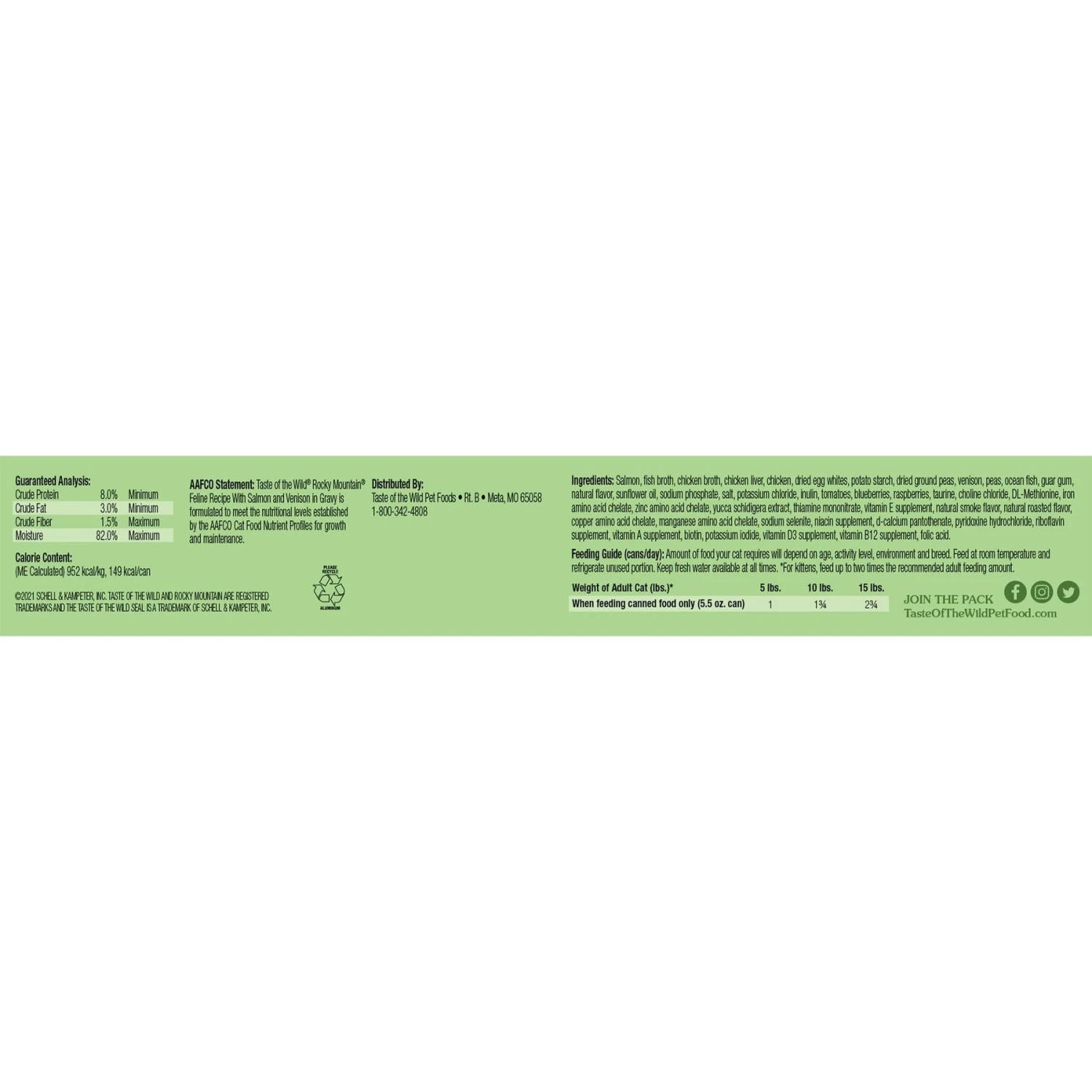 Feed your furry friend’s wild side with Taste of the Wild Rocky Mountain Grain-Free Canned Cat Food. Featuring real salmon as the very first ingredient along with chicken liver, chicken, roasted venison and ocean fish, this delicious and nutritious, grain-free food includes real peas and pea flour that deliver the highly-digestible energy your active cat needs to thrive. Tomatoes, blueberries and raspberries offer natural antioxidant support for overall health and immunity, while added taurine provides vital support for strong eyesight and healthy heart function. Give your cat companion the taste of the wild she constantly craves!