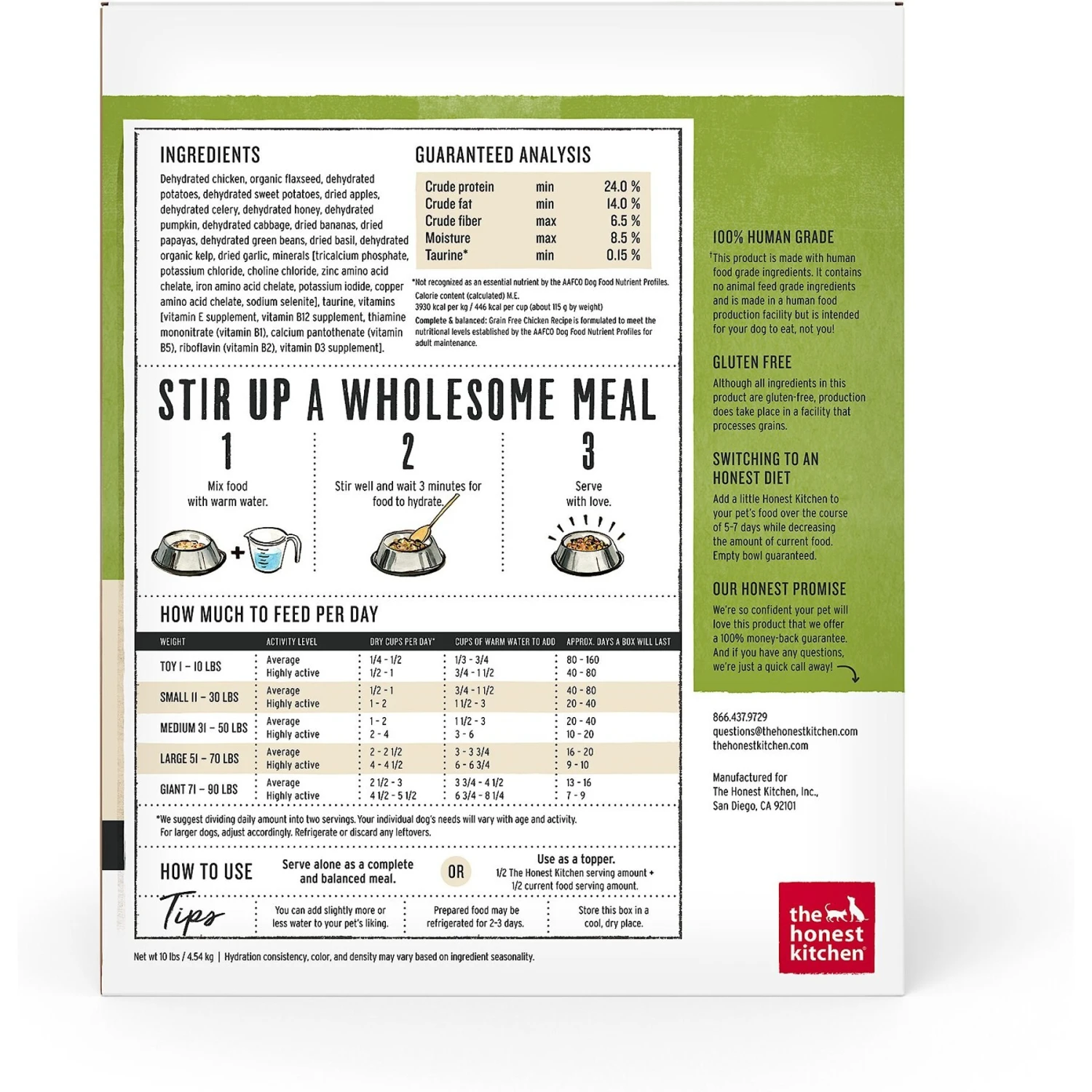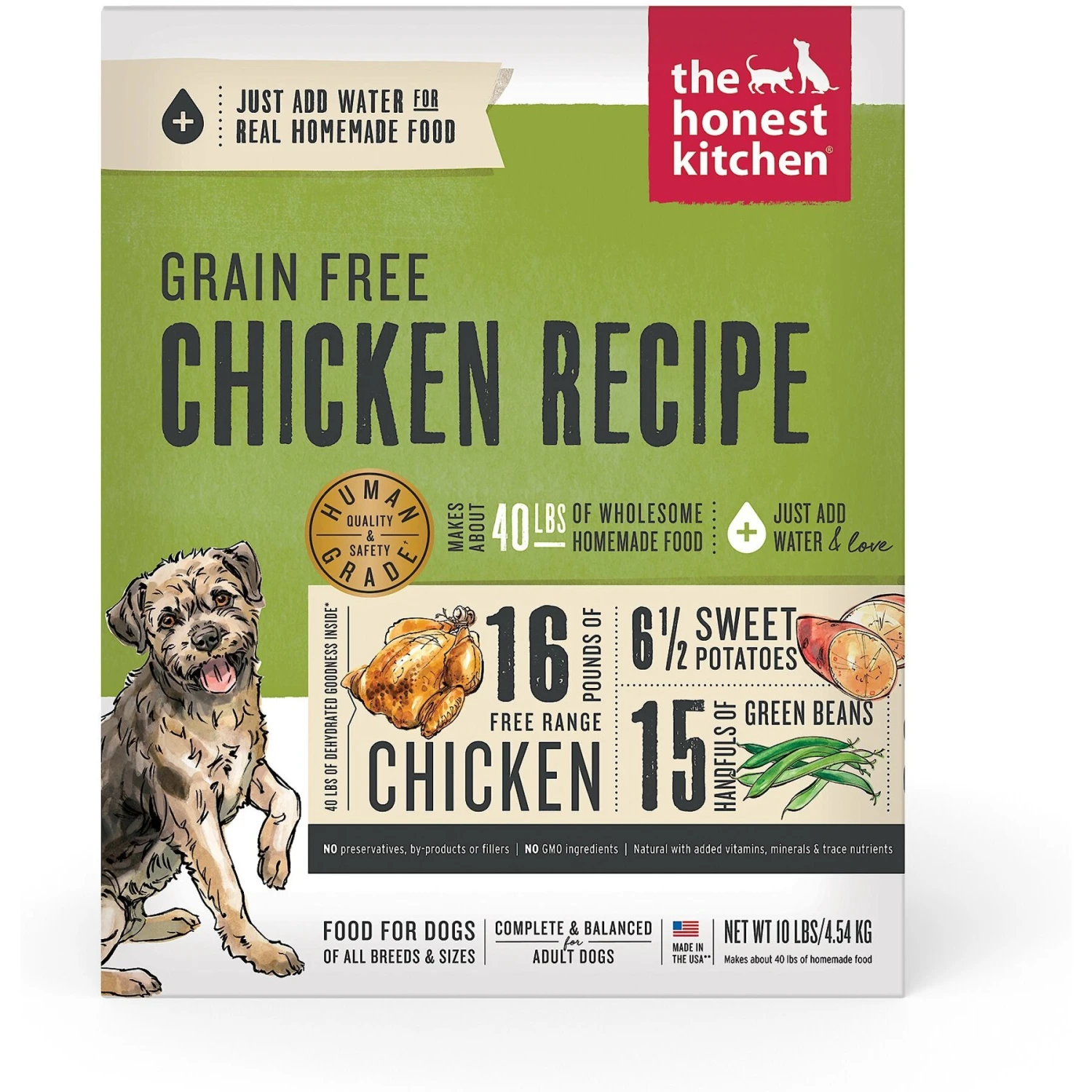 The Honest Kitchen Chicken Recipe Grain-Free Dehydrated Dog Food is crafted with human grade, whole foods to provide your pet with some of the best nutrition possible! This grain-free recipe is formulated with uncompromising quality control standards using real, recognizable ingredients, like free-range chicken, that are gently dehydrated to maintain nutrients and taste. And to meet The Honest Kitchen’s 100% human-grade standard, the same whole foods you’d recognize in your own kitchen are used to make this recipe. Plus, this dog food is made in a human food facility! To serve, simply add warm water and wait three minutes for a fur-esher, homemade meal your canine companion will go head over tail for!