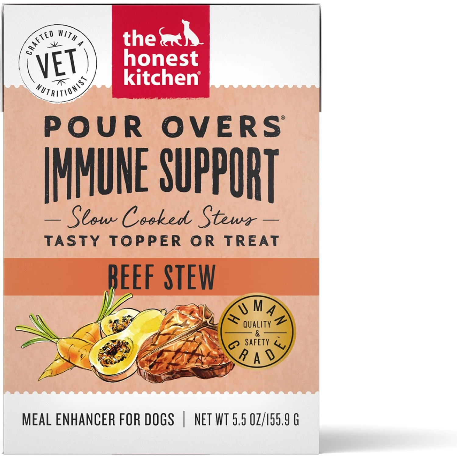 The Honest Kitchen Functional POUR OVERS Immune Support Beef Stew Dog Food Topper makes mealtime extra paw-some for your best friend! This pourable stew is full of ranch-raised beef simmered in a bone broth reduction. It delivers an extra helping of antioxidants to help support your pup’s immune health. It’s made with human-grade ingredients and is free of bad stuff like gums, carrageenan, feed-grade ingredients, meat meals, fillers, GMO ingredients and artificial flavors or preservatives. This yummy stew is packed in a box that’s su-paw easy to use, so you can easily add stew to each meal to encourage your furbaby to clean up every bite.