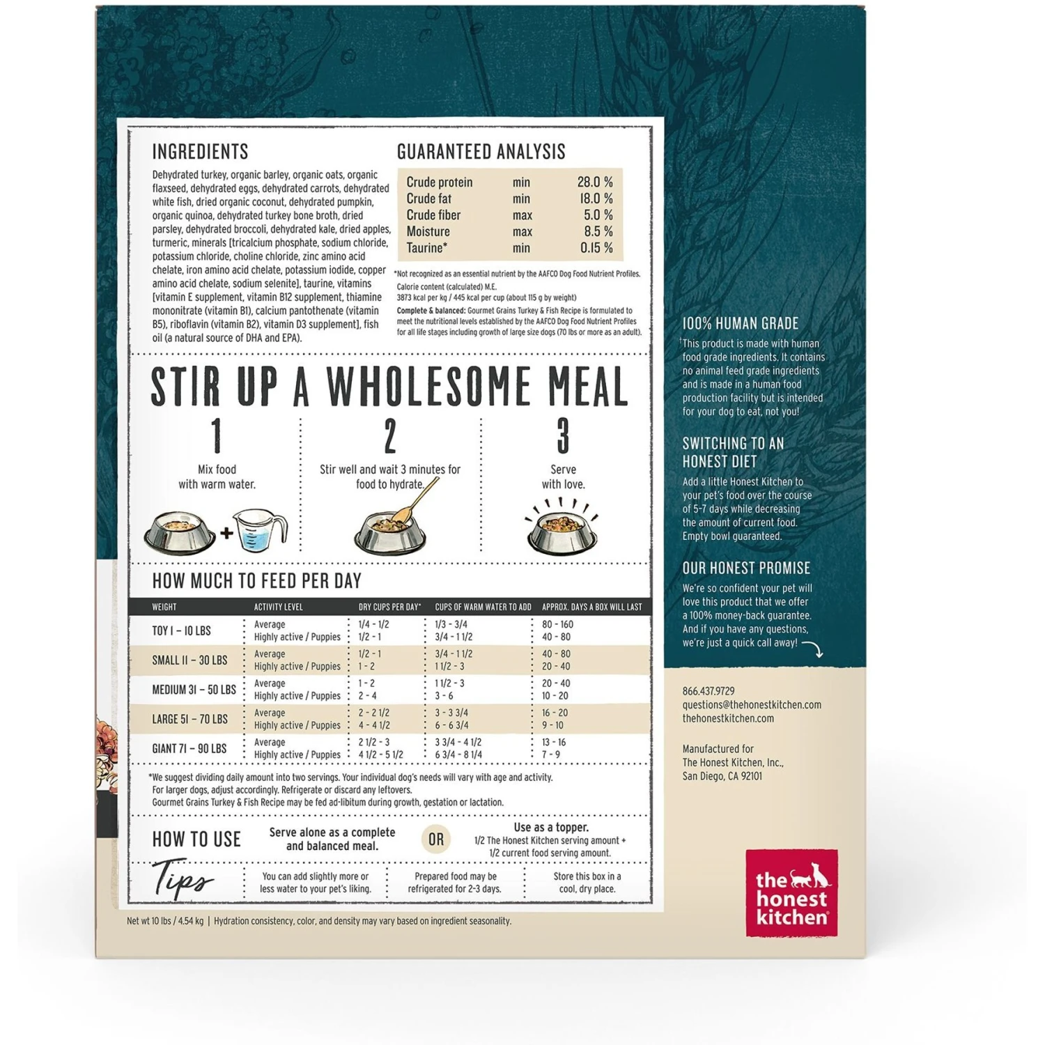 Give your best bud the nutrition he needs with The Honest Kitchen Gourmet Grains Turkey & White Fish Recipe Dehydrated Dog Food! This filler-free recipe is pup-pared with human-grade cage-free turkey, wild-caught fish, organic oats, barley and quinoa that are gently dehydrated to maintain appropriate nutrients, protein levels and crave-worthy taste. Just add warm water and wait three minutes for the food to rehydrate before serving. Even the most chew-sy canine will bark at the delectable taste, and you can rest easy knowing you’re giving him a bone-a-fide, high-quality meal!