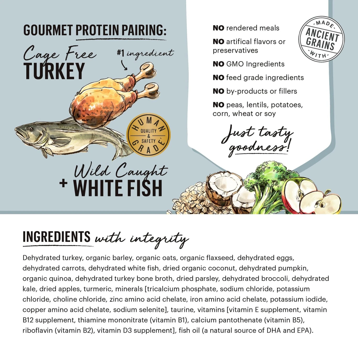 - Free of artificial preservatives, by-products, fillers, GMO ingredients, corn, wheat and soy.