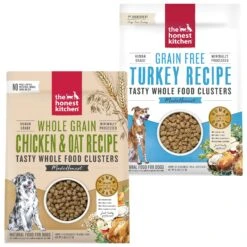 The Honest Kitchen Food Clusters Whole Grain Chicken & Oat Recipe Dog Food, 5-lb bag—When you care for your pets, you want to feed them food that will care for them right back. The Honest Kitchen Food Clusters Whole Grain Chicken & Oat Recipe Dehydrated Dog Food provides added nutrition and flavor to any mealtime. The clusters are made from cage-free chicken that’s been cold-pressed and dehydrated. This honest recipe is free of artificial flavors or preservatives, GMOs, gums, carrageenan, feed-grade ingredients, meat meals or fillers. The Honest Kitchen only offers human-grade food for your precious pooch, meaning the clusters are made from whole foods you’d recognize from your own kitchen.