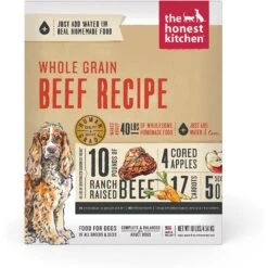 The Honest Kitchen Whole Grain Beef Recipe Dehydrated Dog Food is crafted with human grade, whole foods to provide your pet with some of the best nutrition possible! This whole grain recipe is formulated with uncompromising quality control standards using real, recognizable ingredients, like ranch-raised beef, that are gently dehydrated to maintain nutrient and taste. And to meet The Honest Kitchen’s 100% human-grade standard, the same whole foods you’d recognize in your own kitchen are used to make this recipe. Plus, this dog food is made in a human food facility! To serve, simply add warm water and wait three minutes for a fur-esher, homemade meal your canine companion will go head over tail for!