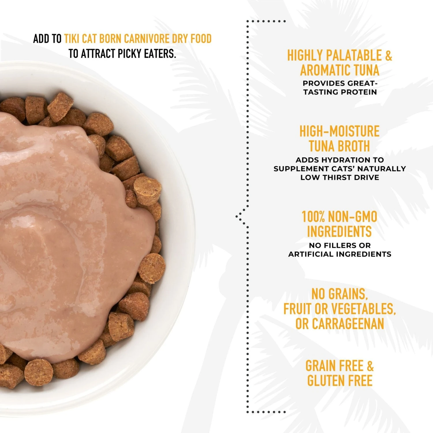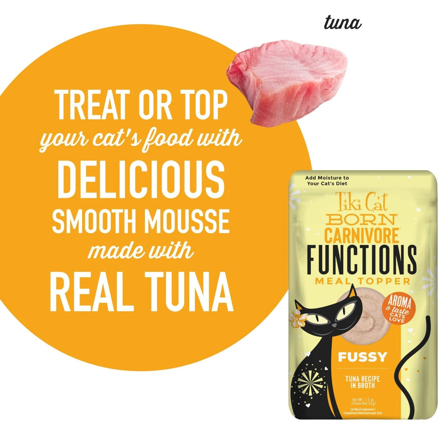 The Tiki Cat Born Carnivore Fussy Functional Cat Food Topper is a su-purr tasty way to entice your picky kitty. Just squeeze this silky smooth topper on Tiki Cat Born Carnivore dry food (sold separately) or feed it alone. This topper is made with real flaked tuna, so it’s brimming with the fishy flavor and aroma that cats love. It gives your kitty a boost of protein and moisture to support his overall health. This topper also adds important moisture to your furbaby’s meal.
