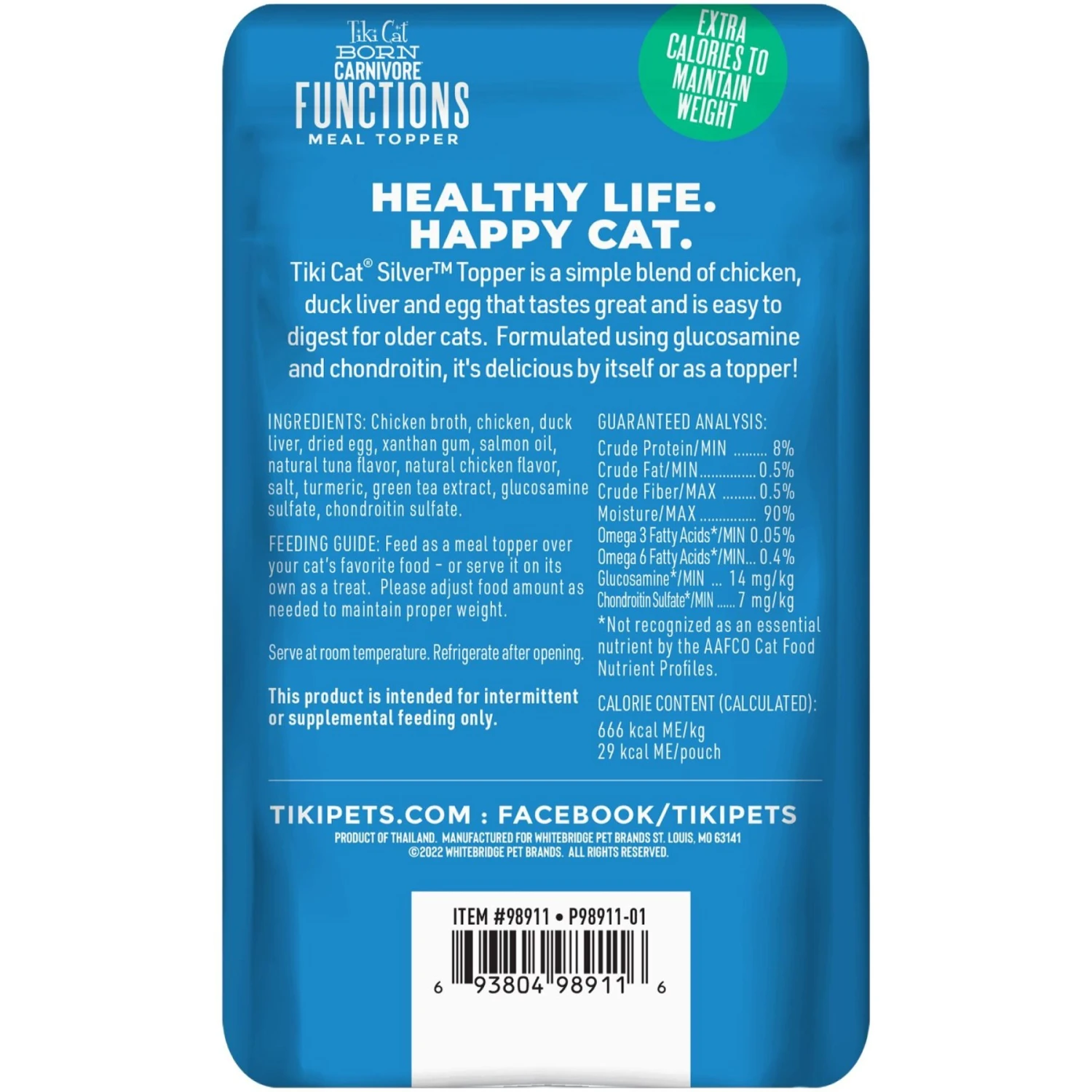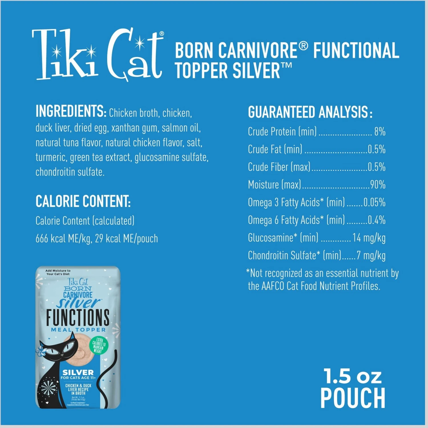 The Tiki Cat Born Carnivore Silver Functional Cat Food Topper is a su-purr tasty way to give your senior cat nutrition customized just for his life stage. Just squeeze this silky smooth topper on Tiki Cat Born Carnivore dry food (sold separately) for an extra boost of protein, moisture and support for healthy joints and a strong immune system. It’s a paw-some way to give your furbaby the nutrition he needs in his silver years.