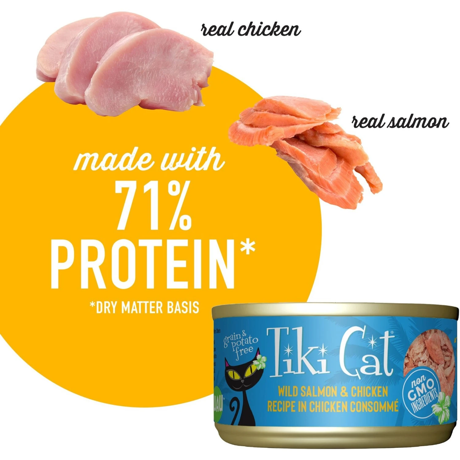 Bring some lei-worthy nutrition to your kitty’s bowl with the Tiki Cat Napili Luau Wild Salmon & Chicken in Chicken Consomme Grain-Free Canned Cat Food. It’s a luau of flavors purr-fectly fit for your furry carnivore, with succulent shredded chicken and flaked wild-caught Alaskan salmon as the top ingredients, slowly simmered in real chicken broth. Since it’s made with actual broth, it provides plenty of moisture to keep your pal hydrated and support digestive and urinary health. And it’s packed with essential vitamins, omegas, minerals and taurine so it’s a complete and balanced diet for cats of all ages, with zero grains, gluten, carbohydrates, starches or flours.