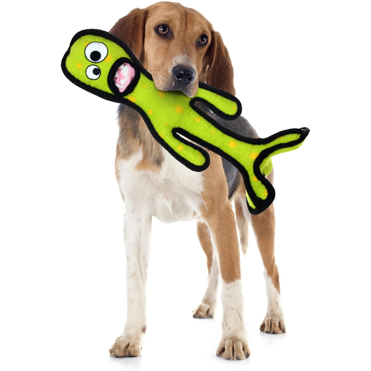Tuffy’s Alien G6 Dog Toy is one of the most durable toys available. It’s made with three layers of safe, non-toxic fibers: soft fleece, industrial grade luggage material, and plastic coating. All three are bonded and sewn together to make one ultra “tuff” layer, ensuring this toy is just as durable as it is fun. The Alien G6 Dog Toy also has a protective pouch around its squeaker as an added safety measure in the unlikely event your dog gets to the core. This toy is great for indoor use because of its soft exterior, perfect for outdoor use because it floats in water, and easy to clean because it’s machine washable.