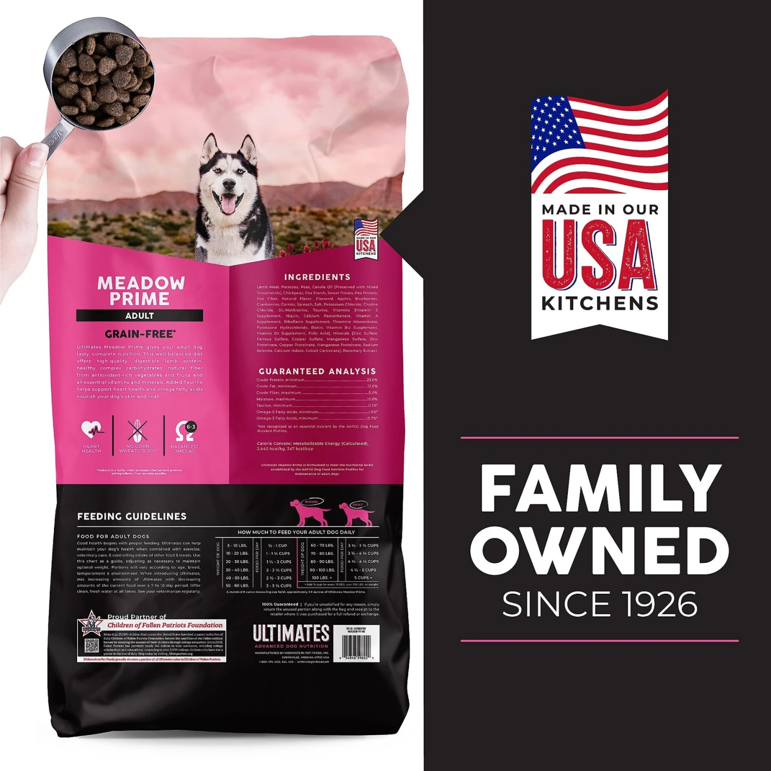 Pro Pac Ultimates Meadow Prime Lamb & Potato Grain-Free Dry Dog Food is a hearty grain-free and gluten-free formula that provides the ultimate in canine nutrition. Premium quality lamb meal is used as the primary protein source to supply essential amino acids that help maintain strong muscles and a healthy, shiny coat. This antioxidant-rich formula is also fortified with vitamins A and C along with nutrient-packed fruits and vegetables like apples, blueberries, carrots and spinach, which contain natural fiber to help with overall digestion.