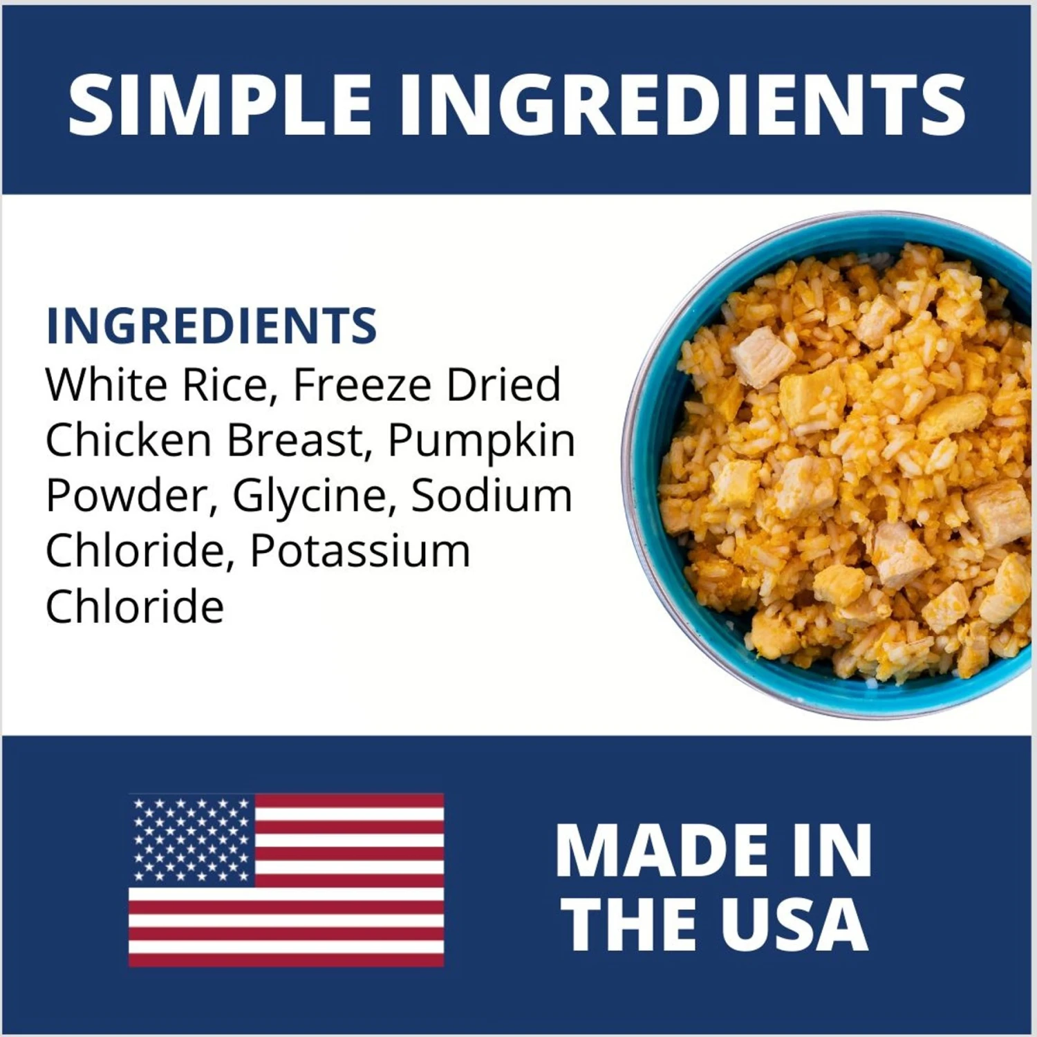 Under the Weather Rice, Chicken & Pumpkin Freeze-Dried Dog Food is a quick and convenient bland diet solution featuring 100% cage-free chicken breast, white rice, pumpkin powder and electrolytes for healthy hydration levels. Serve it when your veterinarian recommends a bland diet to help soothe your dog’s digestive tract. This diet is only to be used until healthy digestion is restored, or for as long as your veterinarian recommends. All ingredients are raised or grown in the USA. The premium, white meat chicken is raised without antibiotics or hormones and is processed in a human-grade facility. Plus, this formula contains no meat by-products, gluten, artificial flavors, dyes or chemicals. Only the best for your dog!