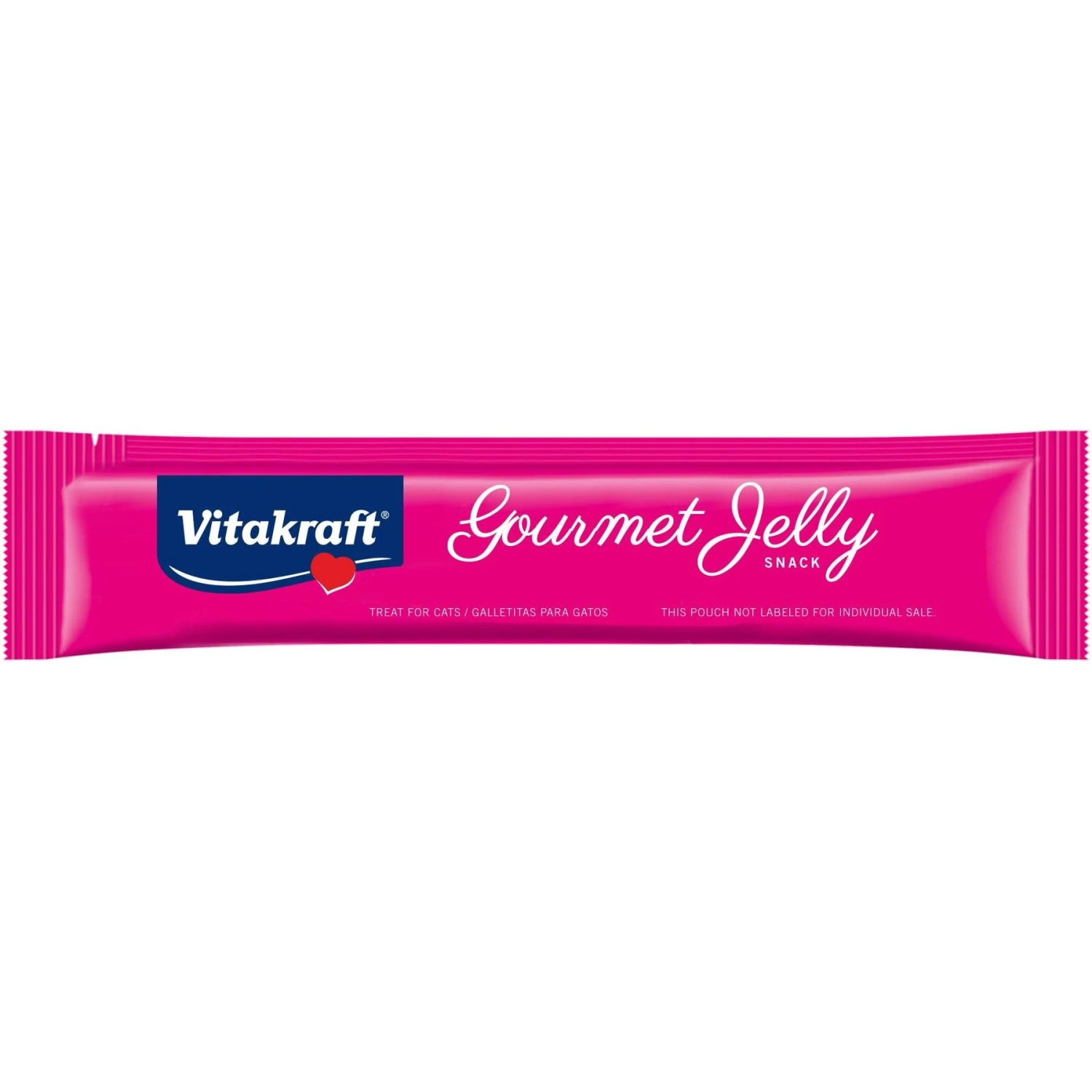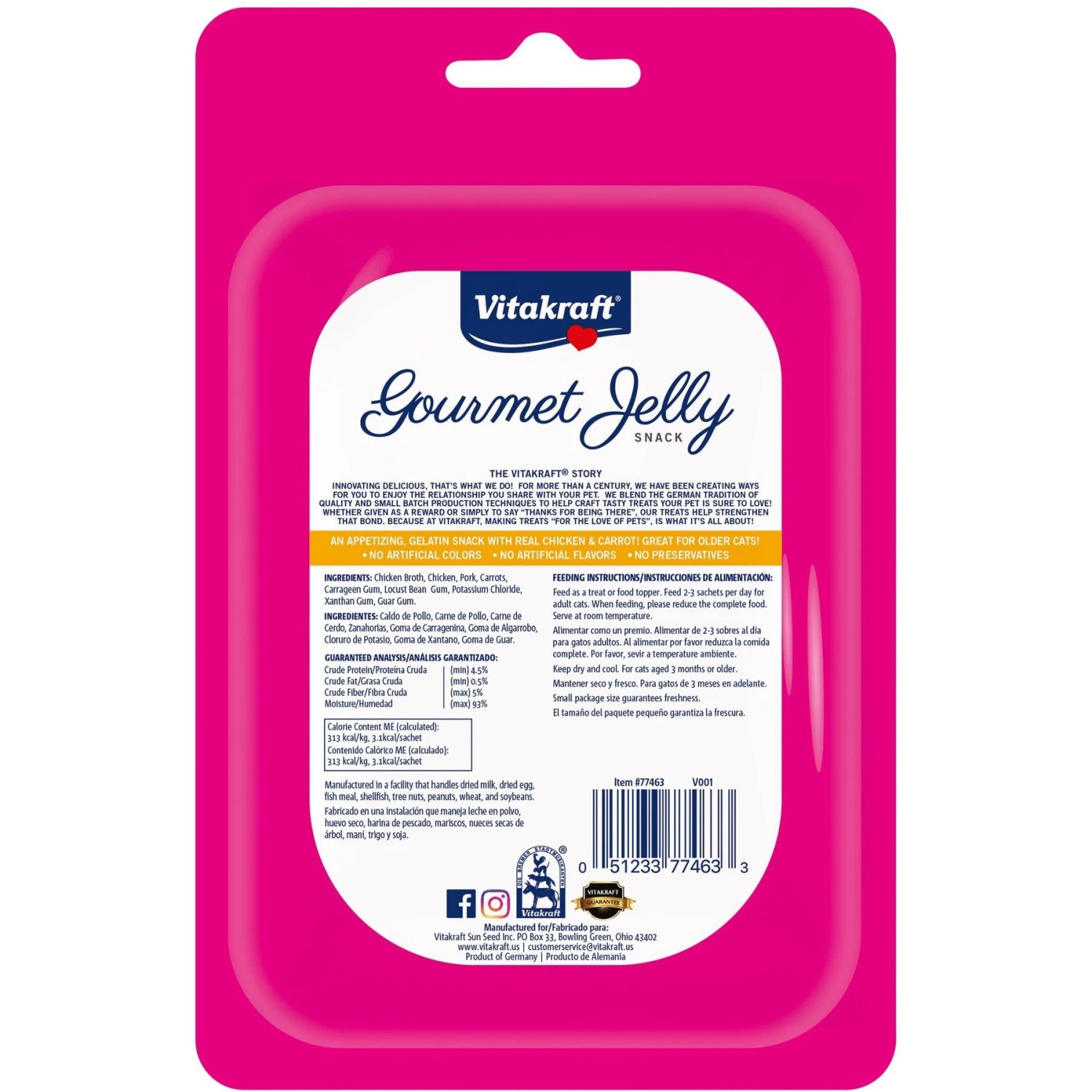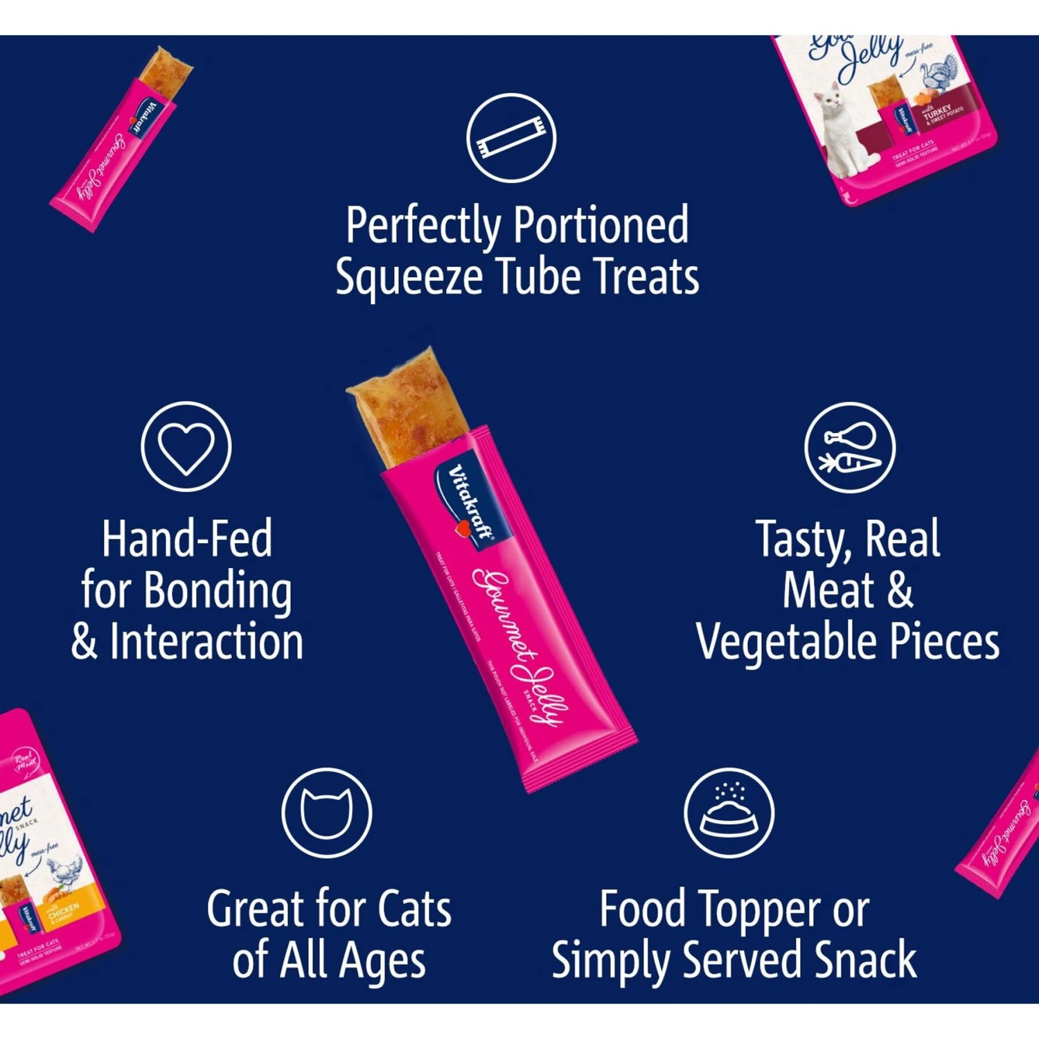 Vitakraft Gourmet Jelly Squeezable Cat Treats come in individually portioned tubes, making these cat treats purr-fectly lickable, mess-free and fresh! Squeeze up the tube treat and feed it to your kitty by hand for some precious bonding moments, or pour it over kibble (sold separately) to make mealtime extra tempting. Gourmet Jelly treats are a delectable snack full of real meat and veggie pieces you can see. They’re also a great way to hydrate your kitty with extra liquid—something a lot of cats are missing from their diets. These low-calorie treats are paw-ticularly great for senior cats and kitties with dental issues.