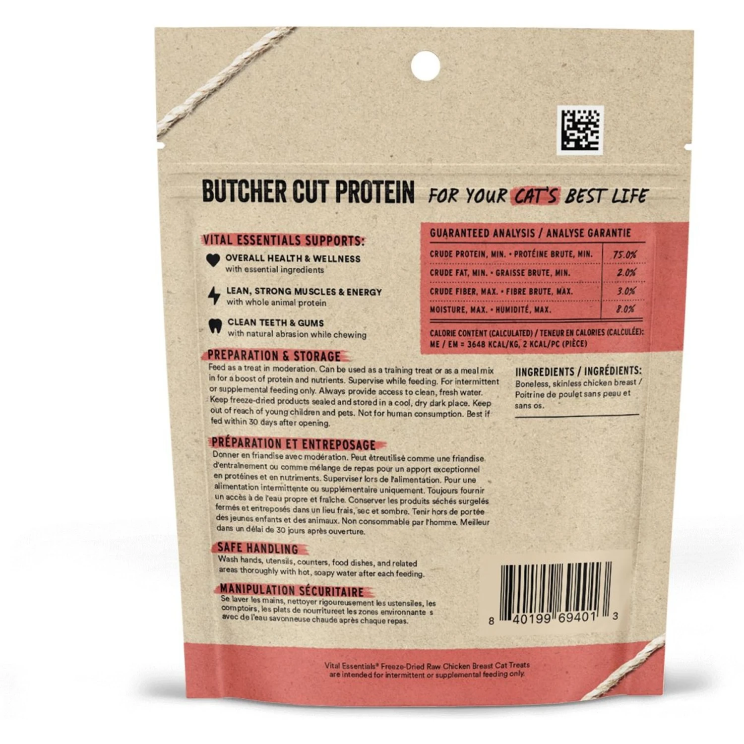 Vital Essentials Vital Chicken Breast Freeze-dried Cat Treats satisfy your cat’s carnivorous cravings with a healthy single-protein treat. It’s made with only fresh, whole single-sourced USDA chicken breast that has been freeze-dried to preserve vital nutrients without cooking or over-processing. These healthy protein-rich treats are grain-free and full of flavor, which makes them a great option for snack time.