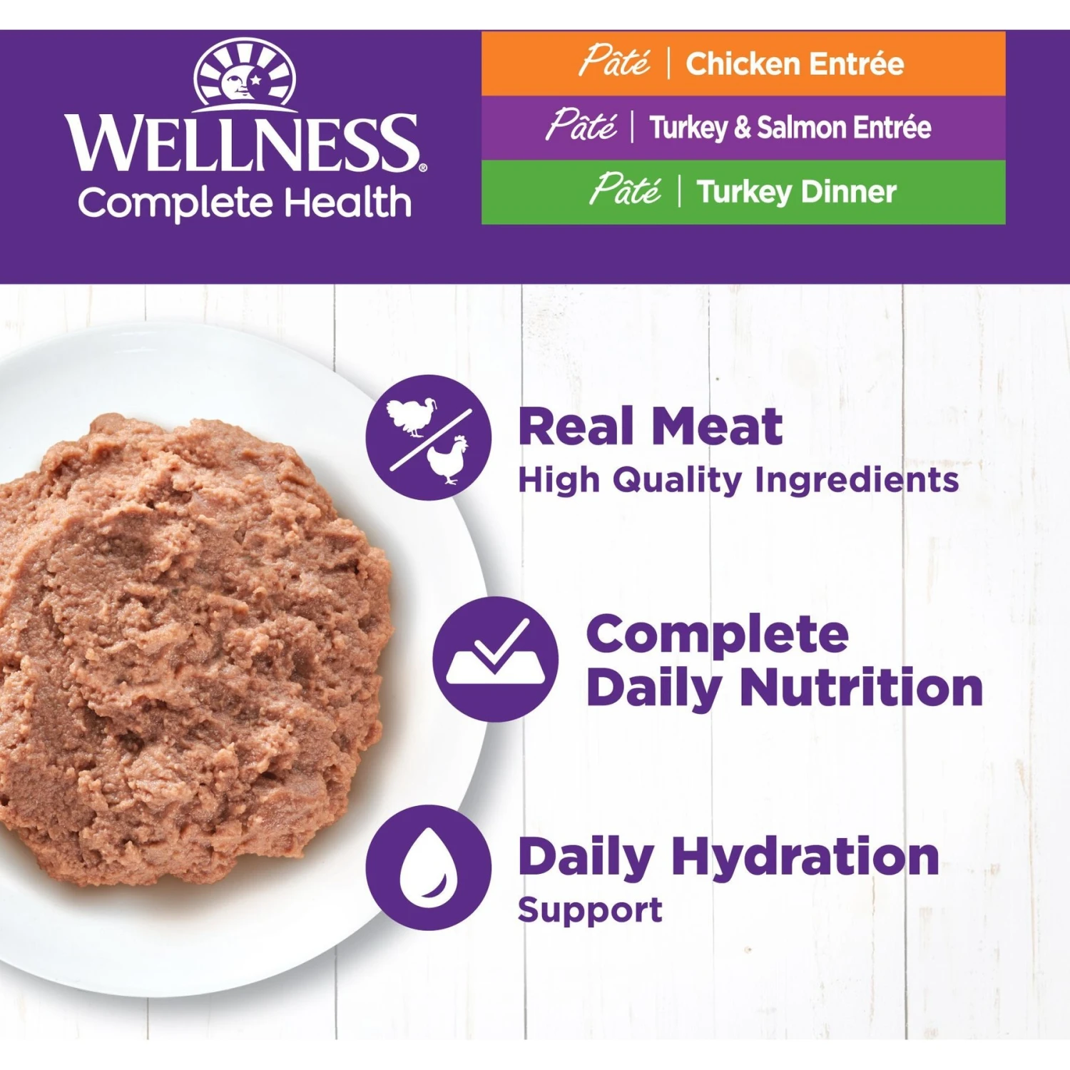 - This Wellness Complete Health variety pack includes the following recipes: Chicken Entree Pate, Turkey Dinner Pate, and Turkey & Salmon Entree Pate.