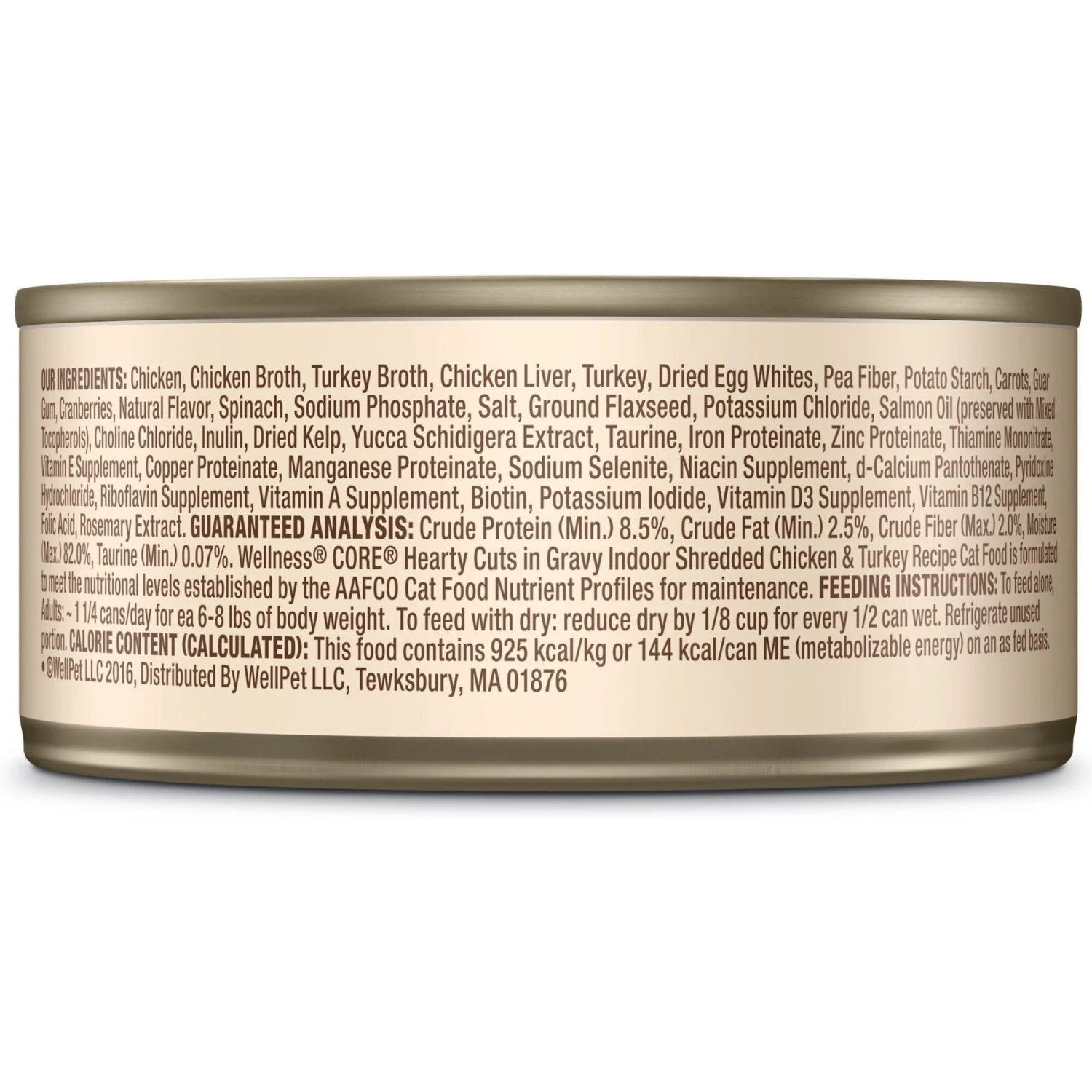 Nourish your kitty’s primal essence with the protein-rich nutrition of Wellness CORE Grain-Free Hearty Cuts in Gravy Indoor Shredded Chicken & Turkey Recipe Canned Cat Food. With chicken and turkey as the top ingredients, this nutrient-dense, grain-free recipe contains all the protein your pal needs to support his strong muscles and energy to fuel all his adventures. Every bite is packed with omegas from flaxseeds and salmon oil to maintain a healthy skin and coat, plus antioxidants, taurine, vitamins and minerals to support immunity and well-being. Serve up a bowl and feel good about providing your pal with everything he needs to thrive from the core, and nothing you wouldn’t want him to eat, like wheat, fillers, or anything artificial.