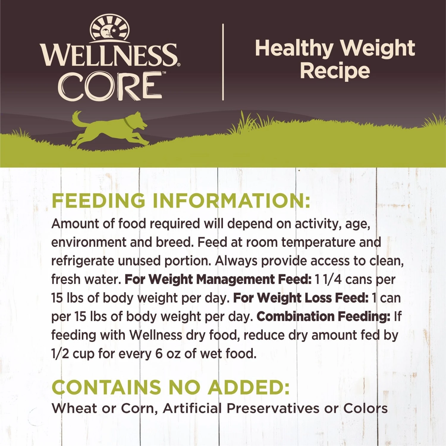 Help keep your four-legged friend from getting too fluffy with Wellness CORE Natural Weight Management Dog Food. This grain-free, canned wet food for dogs is packed with premium protein as well as a proprietary blend of botanicals and nutritional supplements. It is crafted using advanced natural nutrition with a savory flavor that dogs love. This wet dog food features proteins that are expertly balanced with nutrient-rich superfoods. It is designed to promote lean body mass and muscle tone while encouraging whole body health.