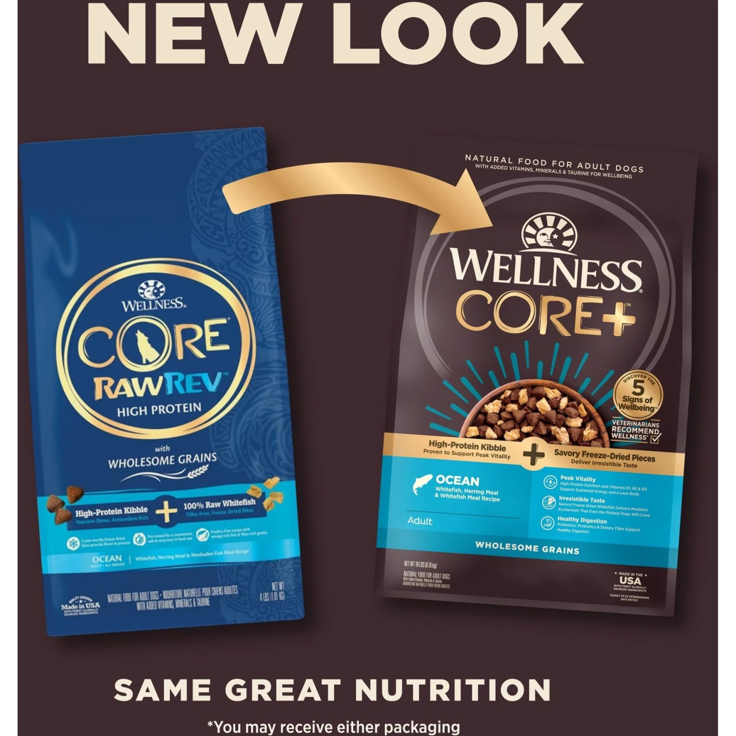 Give your dude a different kind of seafood with Wellness CORE RawRev Wholesome Grains Ocean Original Recipe. This tasty raw food for dogs is thoughtfully balanced with high-protein kibble, wholesome grains and nutrient-rich superfoods to promote whole body health. It features 100% freeze-dried fish bites for a boost of savory flavor that dogs love. This raw dog food is crafted using advanced natural nutrition to support lean body mass, muscle tone and a healthy coat and skin. It is fortified with omega fatty acids, antioxidants, glucosamine, probiotics and taurine and does not contain any fillers, wheat, corn or soy.