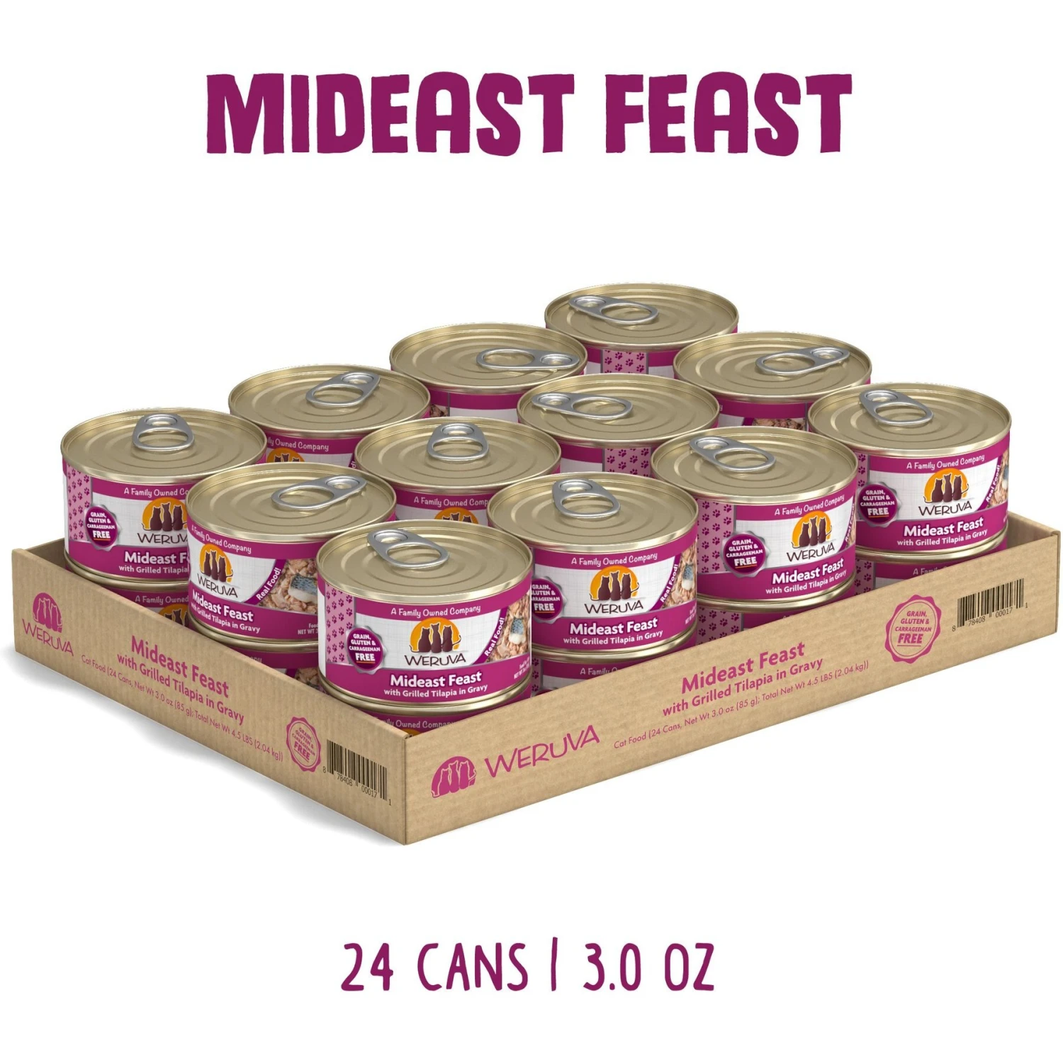 Bring some fresh-catch nutrition to your kitty’s bowl with Weruva Mideast Feast with Grilled Tilapia in Gravy Grain-Free Canned Cat Food. Made with tuna and tilapia as the top ingredients, every bite is loaded with the meat your little carnivore craves, and all the protein he needs for healthy muscles. Since it’s formulated with a perfectly-balanced blend of vitamins, minerals and heart-healthy taurine, every easy-open can is actually a complete meal—on its own or as a tasty kibble topper. It’s no wonder that for cats everywhere, Weruva is also known as “the best cat food under the sun!”