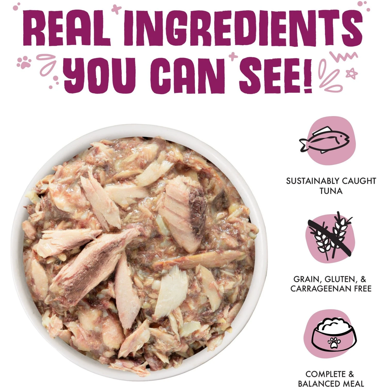 - Grain-free wet food is made with tuna and tilapia as the top ingredients so it’s high in protein sourced from real meat.