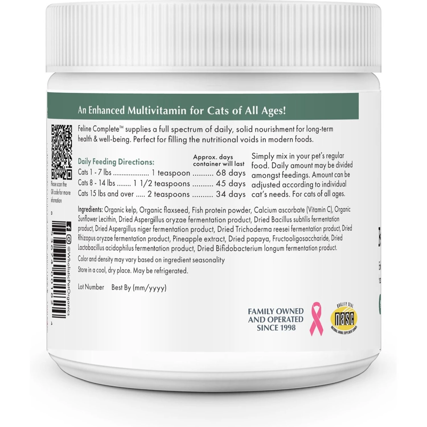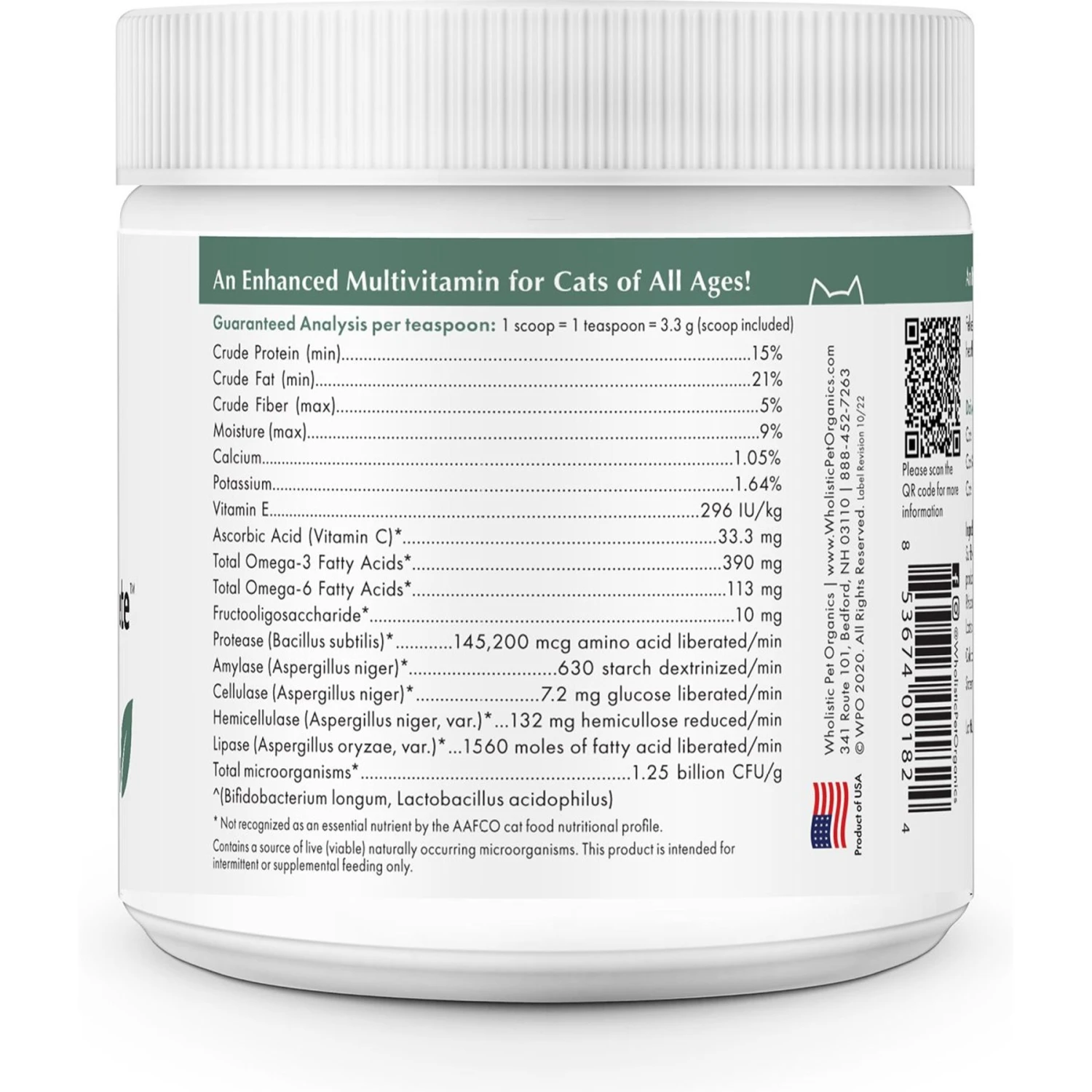 Support your furbaby’s health and wellbeing with the Wholistic Pet Organics Feline Complete Powder Supplement for Cats. This supplement is purr-fect for filling in the nutritional voids of modern foods. It’s full of organic and whole food ingredients. This all-in-one, enhanced multivitamin delivers daily, solid nourishment to support your furbaby’s health. It’s free of fillers, synthetics, GMOs, artificial ingredients and other bad stuff, so you can feel paw-some for feeding it to your kitty.