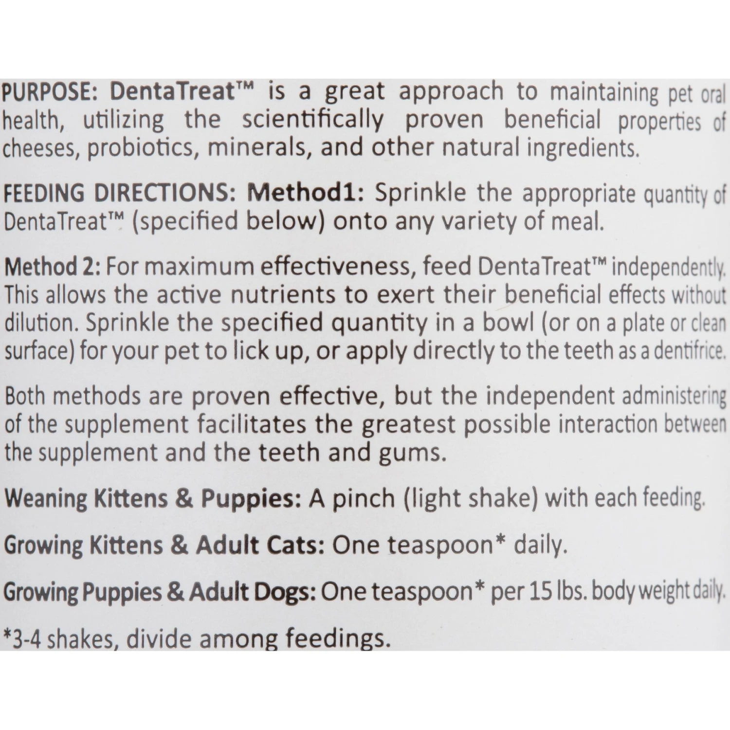 Composed of a special blend of dental-active natural cheeses, minerals, apple polyphenols, and many other ingredients that help to maintain oral health, DentaTreat natural cat and dog supplement can be sprinkled directly onto food, or it can also be used with a toothbrush as a tooth cleaning powder.